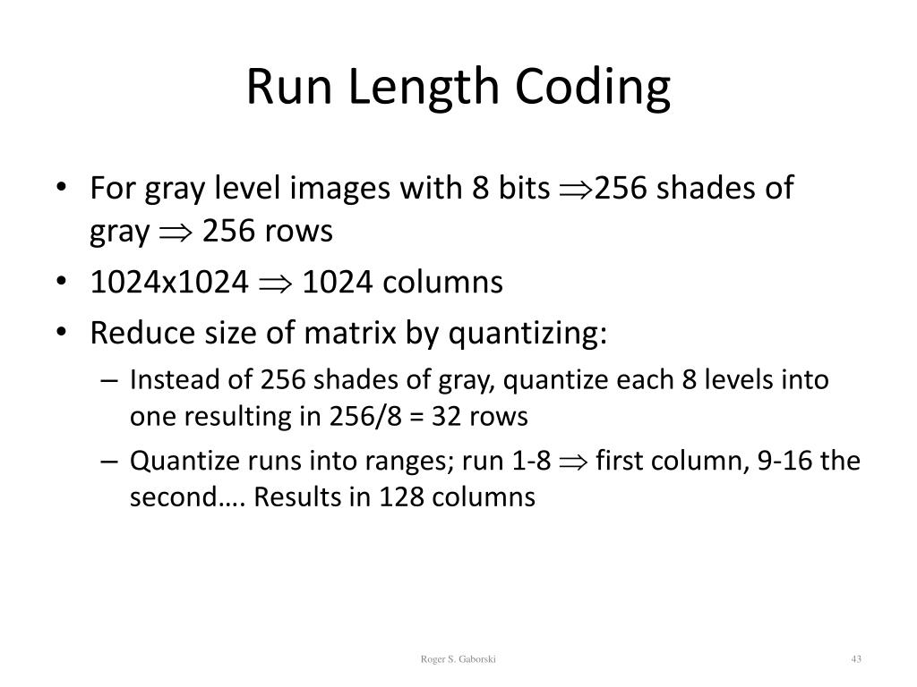 Run Length Coding • For gray level images with 8 bits 256 shades of gray 256 rows • 1024x1024 1024 columns • Reduce size of matrix by quantizing: • Instead of 256 shades of gray, quantize each 8 levels into one resulting in 256/8 = 32 rows • Quantize runs into ranges; run 1-8 first column, 9-16 the second…. Results in 128 columns Roger S. Gaborski