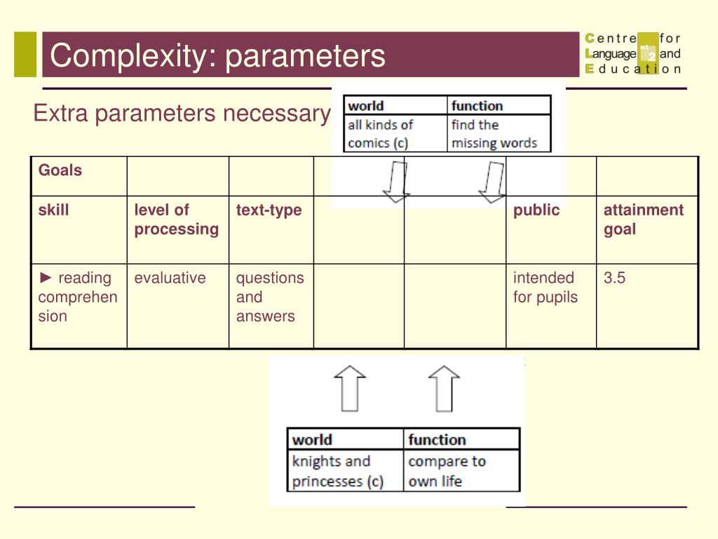 Task complexity Parameters: • Indicated by official attainment targets • language skill, • level of cognitive processing, • type of text, public/audience • Analytic framework of the CLE = + function or purpose(communication, conceptualisation, expression, pleasure, ...).= + ‘world’(the kind of knowledge of the world + level of abstraction of the approach )