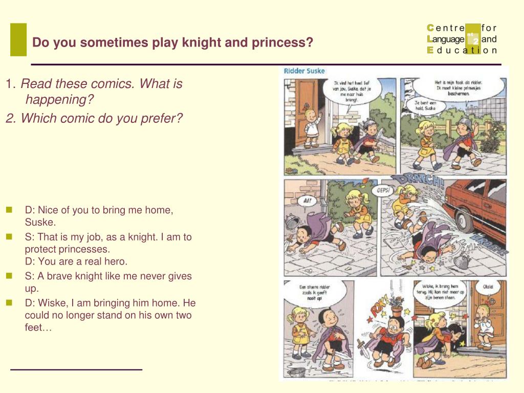 1. Read these comics. What is happening? 2. Which comic do you prefer? D: Nice of you to bring me home, Suske. S: That is my job, as a knight. I am to protect princesses. D: You are a real hero. S: A brave knight like me never gives up. D: Wiske, I am bringing him home. He could no longer stand on his own two feet… Do you sometimes play knight and princess?