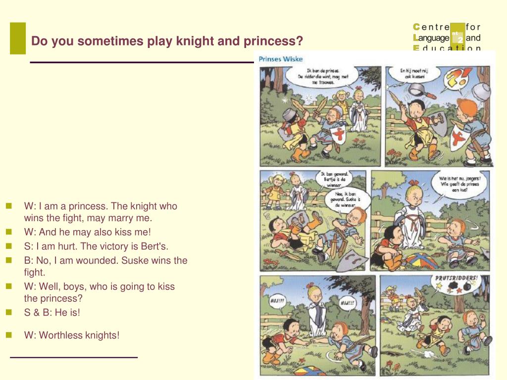 W: I am a princess. The knight who wins the fight, may marry me. W: And he may also kiss me! S: I am hurt. The victory is Bert's. B: No, I am wounded. Suske wins the fight. W: Well, boys, who is going to kiss the princess? S & B: He is! W: Worthless knights! Do you sometimes play knight and princess?