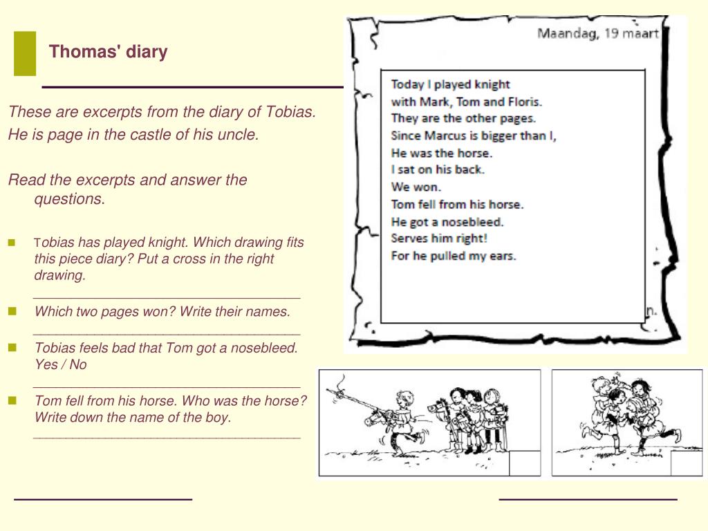 These are excerpts from the diary of Tobias. He is page in the castle of his uncle. Read the excerpts and answer the questions. Tobias has played knight. Which drawing fits this piece diary? Put a cross in the right drawing.___________________________________ Which two pages won? Write their names.___________________________________ Tobias feels bad that Tom got a nosebleed. Yes / No ___________________________________ Tom fell from his horse. Who was the horse? Write down the name of the boy._________________________________________ Thomas' diary