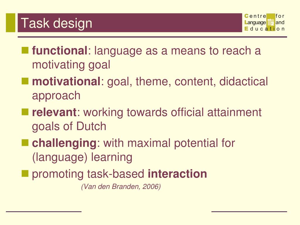 Task design • functional: language as a means to reach a motivating goal • motivational: goal, theme, content, didactical approach • relevant: working towards official attainment goals of Dutch • challenging: with maximal potential for (language) learning • promoting task-based interaction (Van den Branden, 2006)