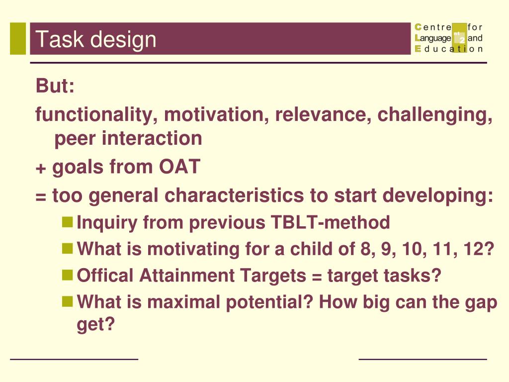 Task design But: functionality, motivation, relevance, challenging, peer interaction + goals from OAT = too general characteristics to start developing: • Inquiry from previous TBLT-method • What is motivating for a child of 8, 9, 10, 11, 12? • Offical Attainment Targets = target tasks? • What is maximal potential? How big can the gap get?