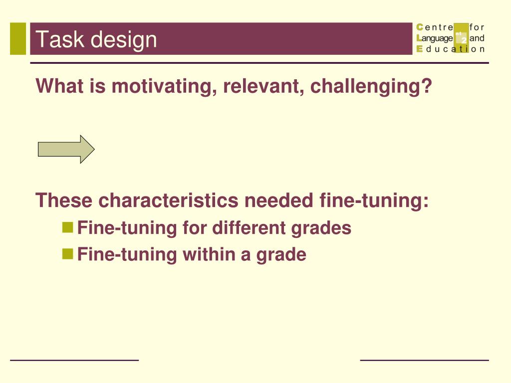 Task design What is motivating, relevant, challenging? These characteristics needed fine-tuning: • Fine-tuning for different grades • Fine-tuning within a grade