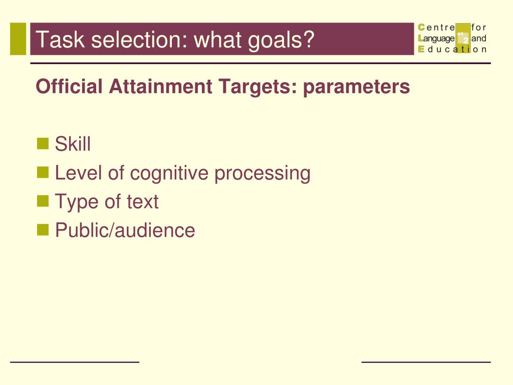 Task selection: what goals? Official Attainment Targets: parameters • Skill • Level of cognitive processing • Type of text • Public/audience