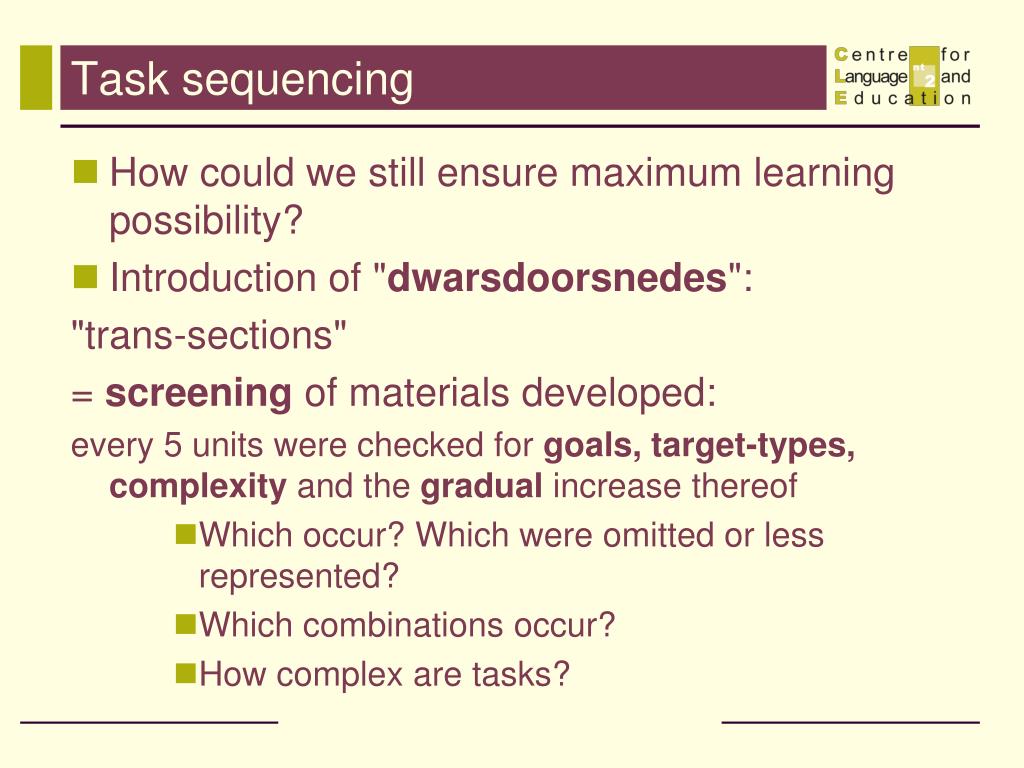 Task sequencing • How could we still ensure maximum learning possibility? • Introduction of "dwarsdoorsnedes": "trans-sections" = screening of materials developed: every 5 units were checked for goals, target-types, complexity and the gradual increase thereof • Which occur? Which were omitted or less represented? • Which combinations occur? • How complex are tasks?