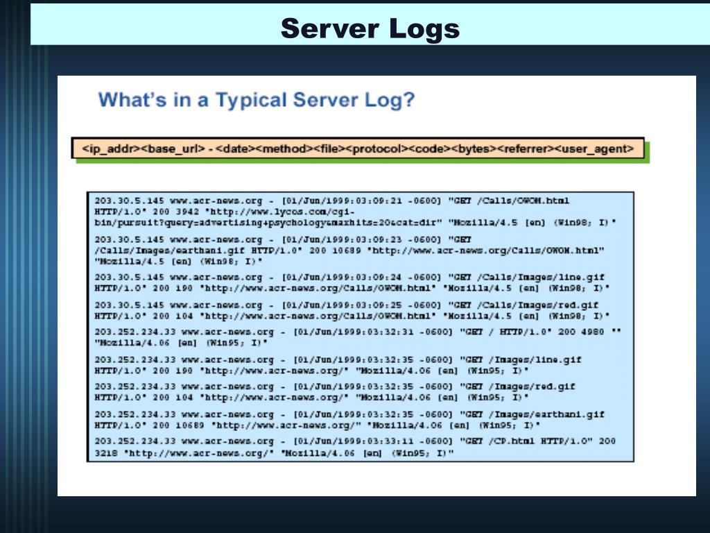 Web Logs • Web servers have the ability to log all requests • Web server log formats: • Most use the Common Log Format (CLF) • New, Extended Log Format allows configuration of log file • Generate vast amounts of data