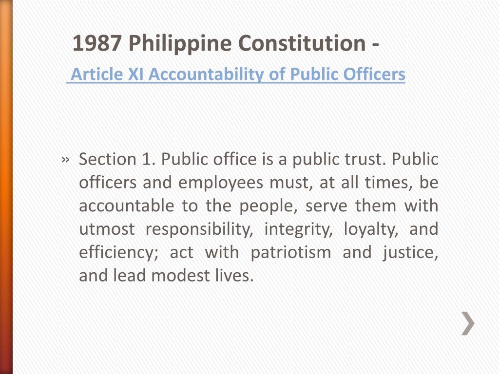 1987 Philippine Constitution - Article XI Accountability of Public Officers • Section 1. Public office is a public trust. Public officers and employees must, at all times, be accountable to the people, serve them with utmost responsibility, integrity, loyalty, and efficiency; act with patriotism and justice, and lead modest lives.