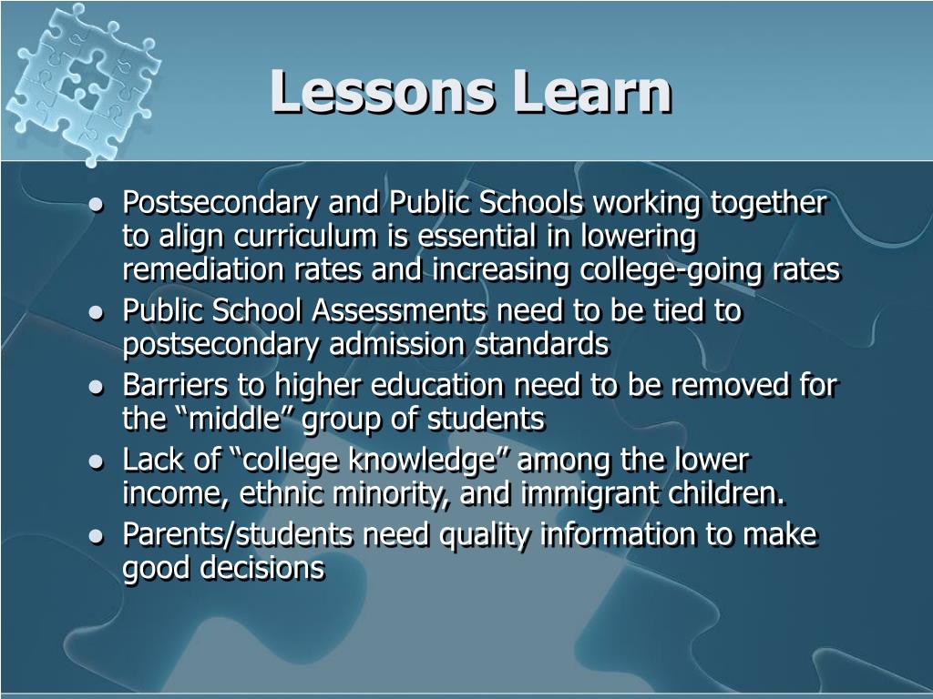 Lessons Learn • Postsecondary and Public Schools working together to align curriculum is essential in lowering remediation rates and increasing college-going rates • Public School Assessments need to be tied to postsecondary admission standards • Barriers to higher education need to be removed for the “middle” group of students • Lack of “college knowledge” among the lower income, ethnic minority, and immigrant children. • Parents/students need quality information to make good decisions