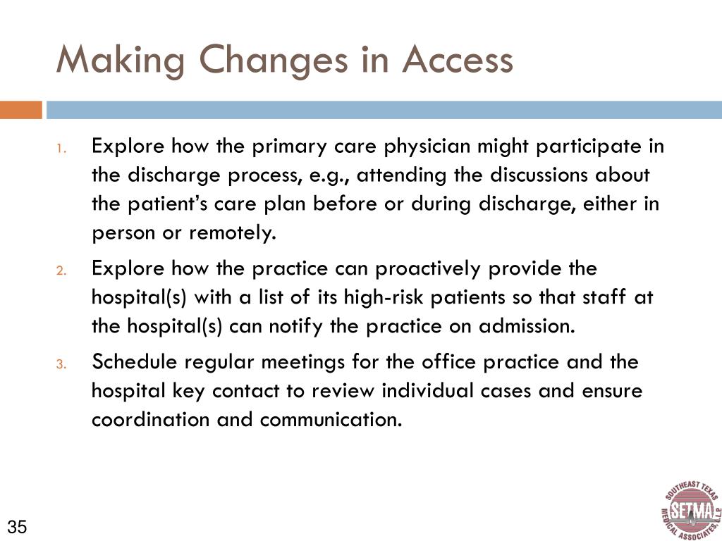 Making Changes in Access • Explore how the primary care physician might participate in the discharge process, e.g., attending the discussions about the patient’s care plan before or during discharge, either in person or remotely. • Explore how the practice can proactively provide the hospital(s) with a list of its high-risk patients so that staff at the hospital(s) can notify the practice on admission. • Schedule regular meetings for the office practice and the hospital key contact to review individual cases and ensure coordination and communication.