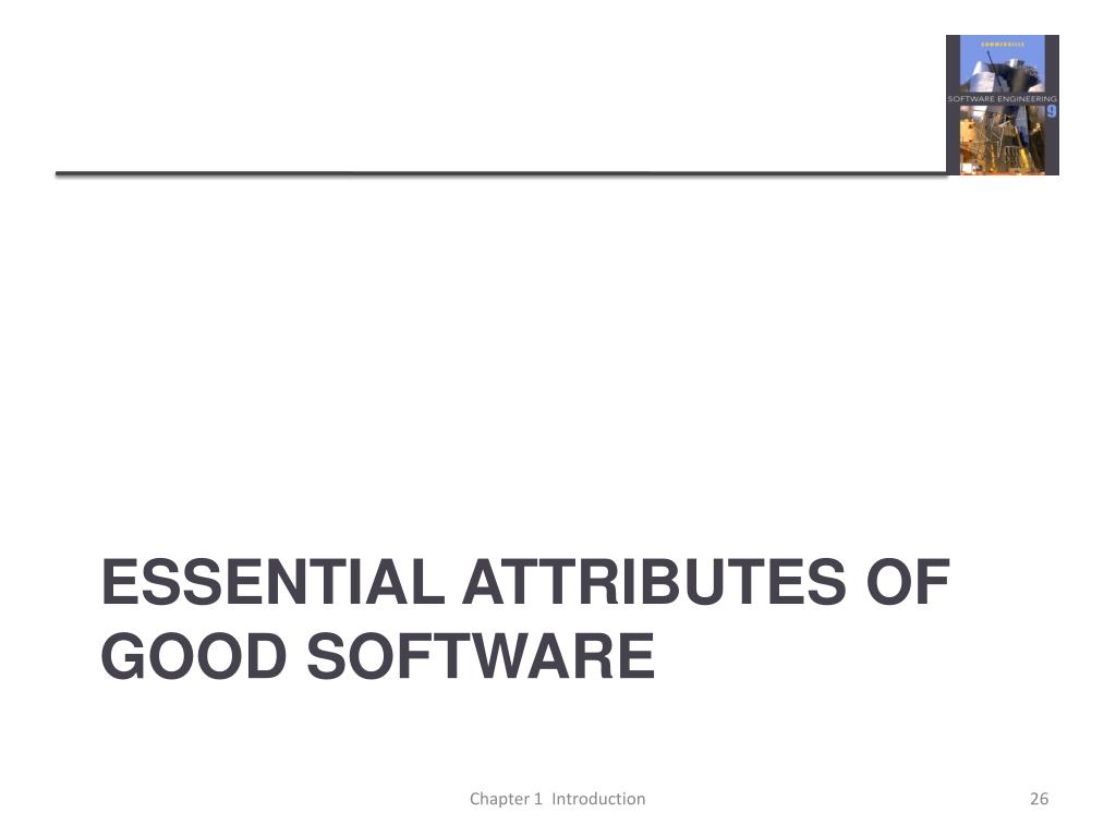 Essential attributes of good software 3. Efficiency • Software should not make wasteful use of system resources such as memory and processor cycles. • Efficiency therefore includes responsiveness, processing time, memory utilization, etc. Chapter 1 Introduction