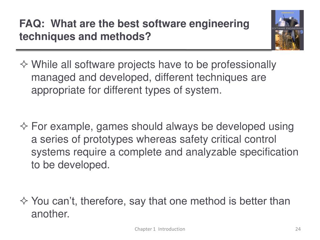 FAQ: What are the best software engineering techniques and methods? • While all software projects have to be professionally managed and developed, different techniques are appropriate for different types of system. • For example, games should always be developed using a series of prototypes whereas safety critical control systems require a complete and analyzable specification to be developed. • You can’t, therefore, say that one method is better than another. Chapter 1 Introduction