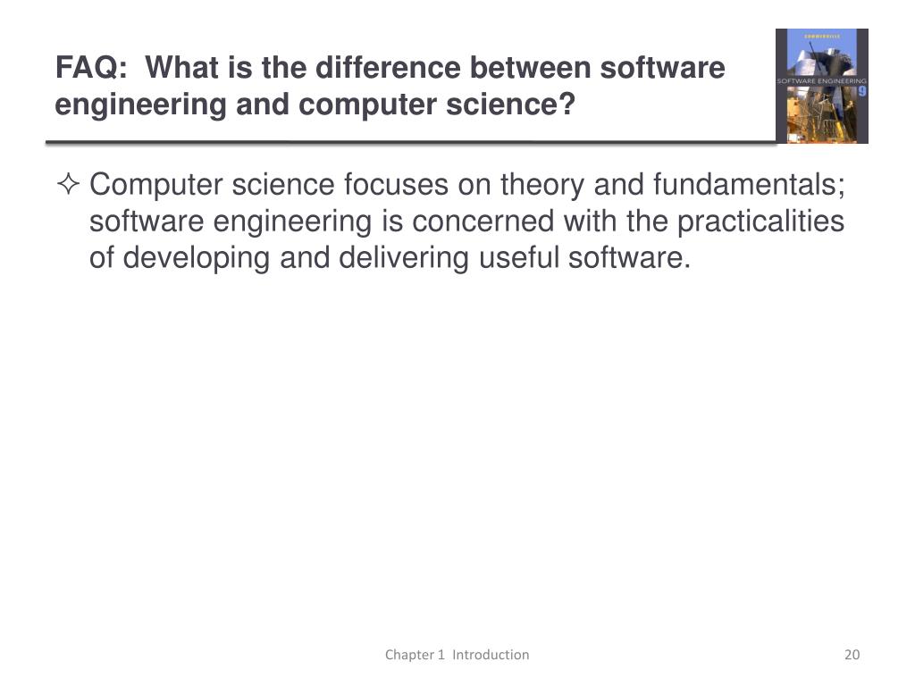 FAQ: What is the difference between software engineering and computer science? • Computer science focuses on theory and fundamentals; software engineering is concerned with the practicalities of developing and delivering useful software. Chapter 1 Introduction