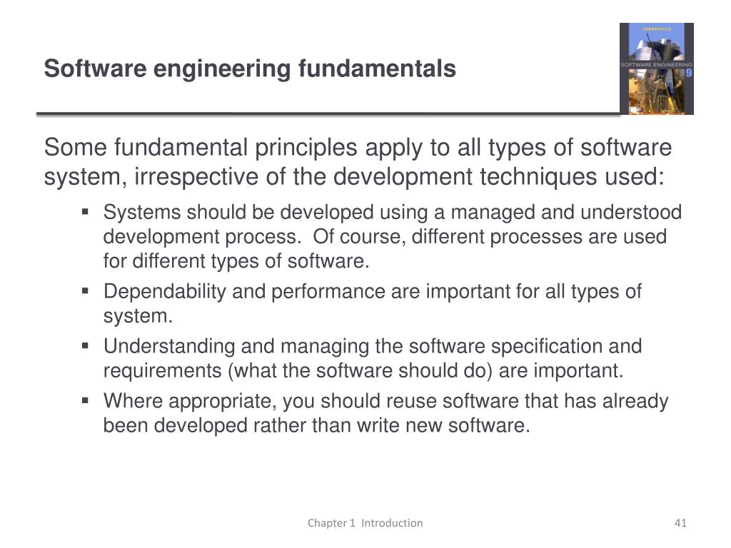 Software engineering fundamentals Some fundamental principles apply to all types of software system, irrespective of the development techniques used: • Systems should be developed using a managed and understood development process. Of course, different processes are used for different types of software. • Dependability and performance are important for all types of system. • Understanding and managing the software specification and requirements (what the software should do) are important. • Where appropriate, you should reuse software that has already been developed rather than write new software. Chapter 1 Introduction