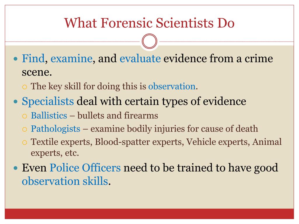 What Forensic Scientists Do • Find, examine, and evaluate evidence from a crime scene. • The key skill for doing this is observation. • Specialists deal with certain types of evidence • Ballistics – bullets and firearms • Pathologists – examine bodily injuries for cause of death • Textile experts, Blood-spatter experts, Vehicle experts, Animal experts, etc. • Even Police Officers need to be trained to have good observation skills.