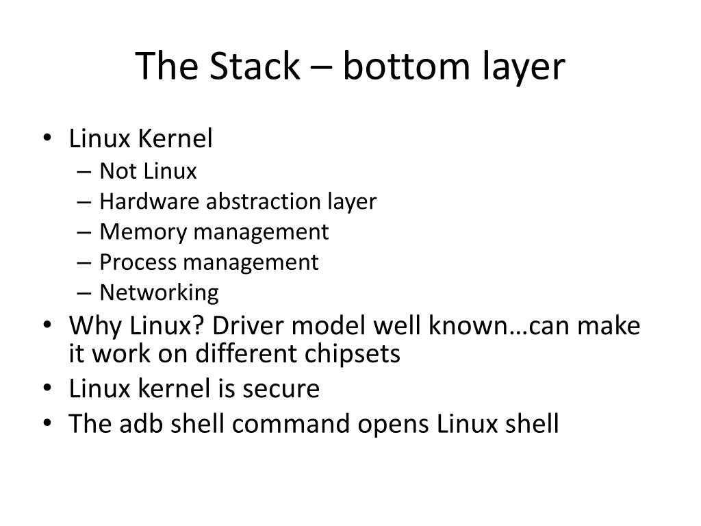 The Stack – bottom layer • Linux Kernel • Not Linux • Hardware abstraction layer • Memory management • Process management • Networking • Why Linux? Driver model well known…can make it work on different chipsets • Linux kernel is secure • The adb shell command opens Linux shell