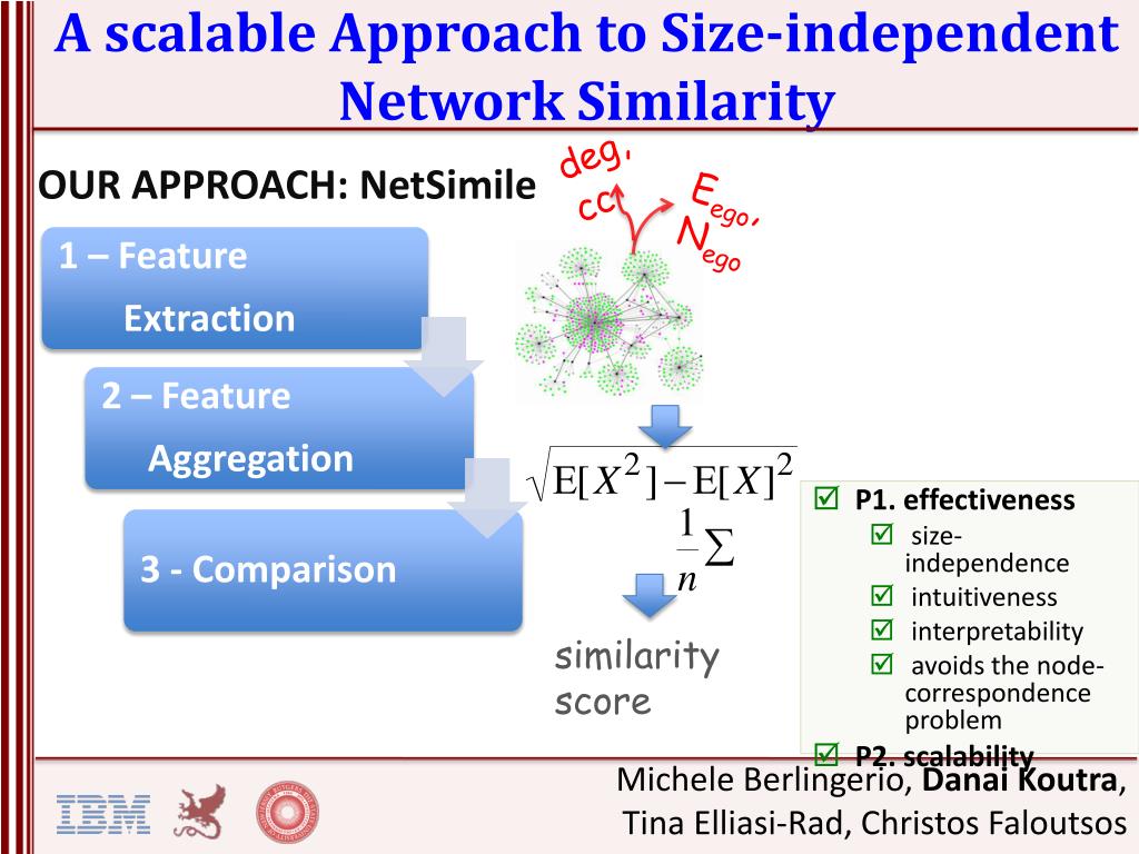 A scalable Approach to Size-independent Network Similarity deg, cc Eego, Nego OUR APPROACH: NetSimile • P1. effectiveness • size-independence • intuitiveness • interpretability • avoids the node-correspondence problem • P2. scalability similarityscore Michele Berlingerio, Danai Koutra, TinaElliasi-Rad, Christos Faloutsos
