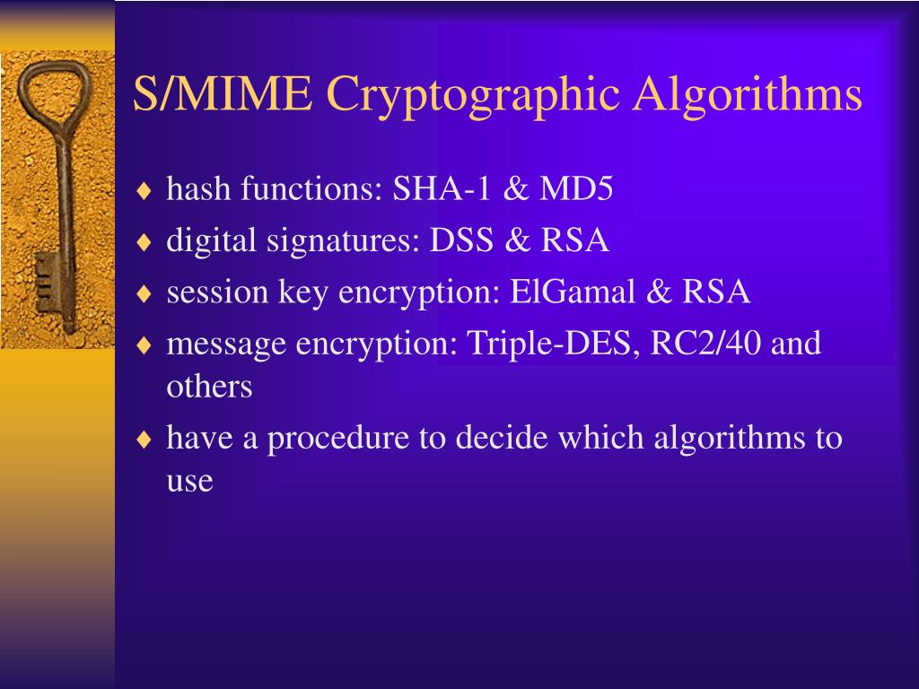 S/MIME Cryptographic Algorithms • hash functions: SHA-1 & MD5 • digital signatures: DSS & RSA • session key encryption: ElGamal & RSA • message encryption: Triple-DES, RC2/40 and others • have a procedure to decide which algorithms to use