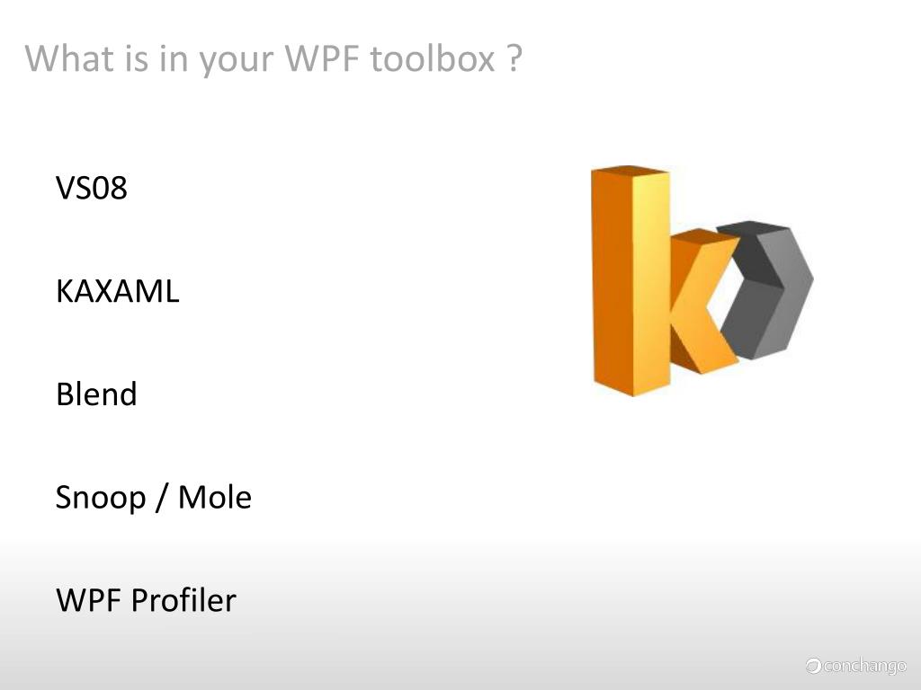What is in your WPF toolbox ? VS08 KAXAML Blend Snoop / Mole WPF Profiler