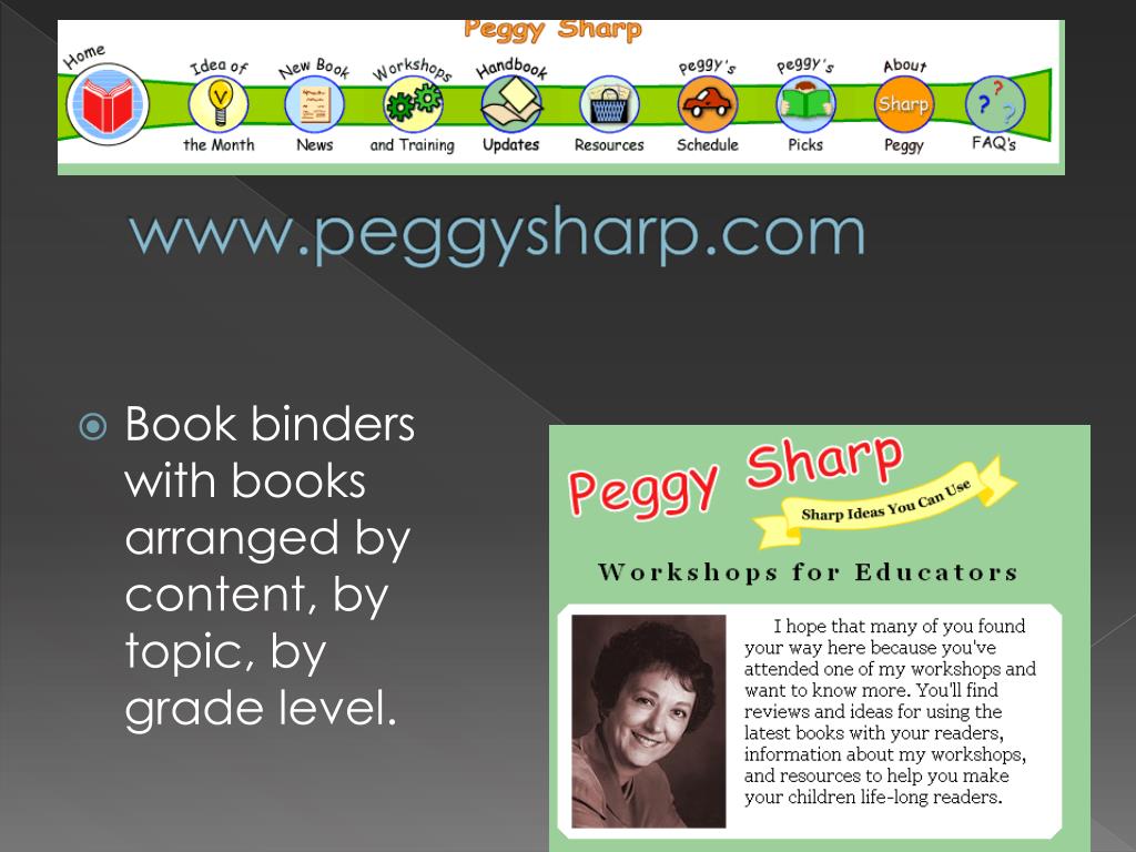 www.peggysharp.com • Book binders with books arranged by content, by topic, by grade level.