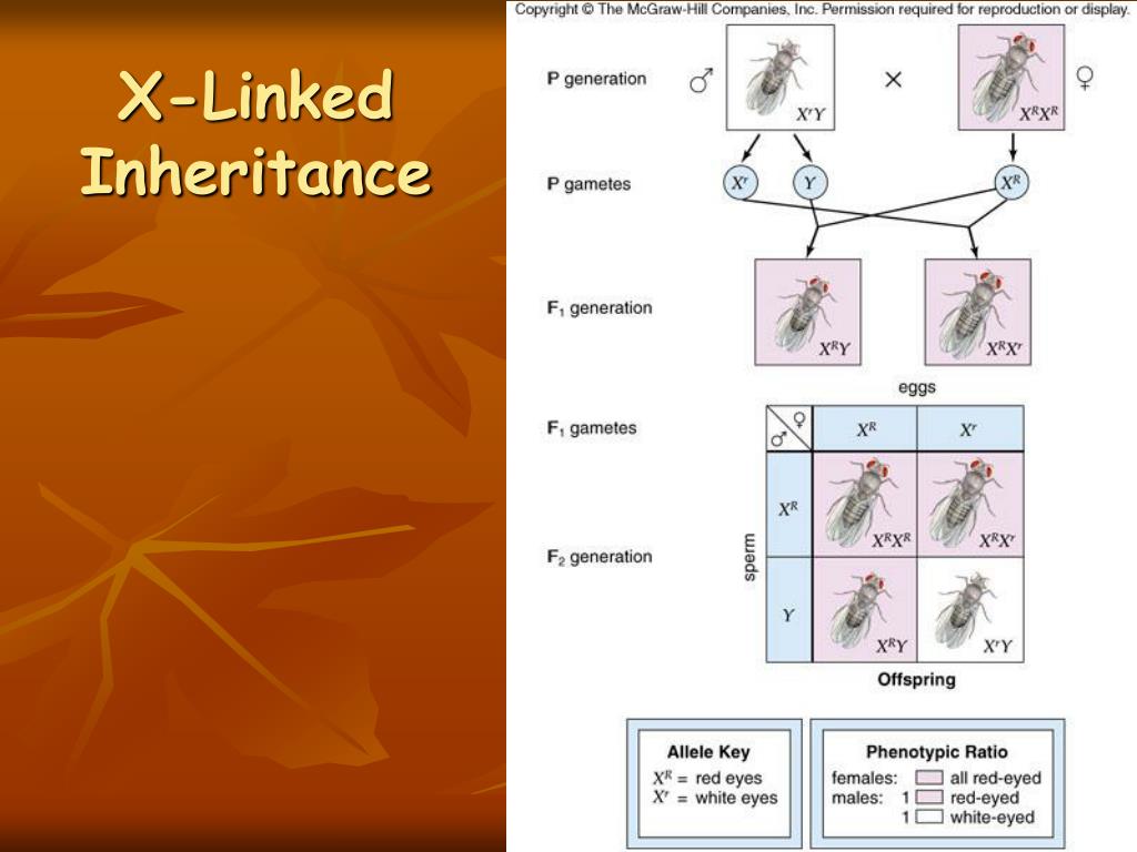 Eye Color in Fruit Flies • Fruit flies (Drosophila melanogaster) are common subjects for genetics research • They normally (wild-type) have red eyes • A mutant recessive allele of a gene on the X chromosome can cause white eyes • Possible combinations of genotype and phenotype: