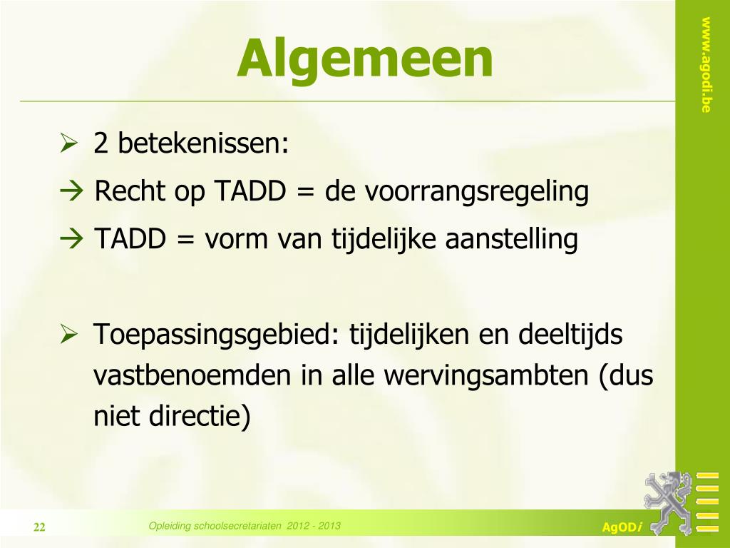Algemeen • 2 betekenissen: • Recht op TADD = de voorrangsregeling • TADD = vorm van tijdelijke aanstelling • Toepassingsgebied: tijdelijken en deeltijds vastbenoemden in alle wervingsambten (dus niet directie) Opleiding schoolsecretariaten 2012 - 2013