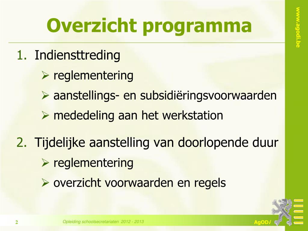Overzicht programma • Indiensttreding • reglementering • aanstellings- en subsidiëringsvoorwaarden • mededeling aan het werkstation • Tijdelijke aanstelling van doorlopende duur • reglementering • overzicht voorwaarden en regels Opleiding schoolsecretariaten 2012 - 2013