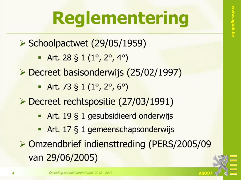 Reglementering • Schoolpactwet (29/05/1959) • Art. 28 § 1 (1°, 2°, 4°) • Decreet basisonderwijs (25/02/1997) • Art. 73 § 1 (1°, 2°, 6°) • Decreet rechtspositie (27/03/1991) • Art. 19 § 1 gesubsidieerd onderwijs • Art. 17 § 1 gemeenschapsonderwijs • Omzendbrief indiensttreding (PERS/2005/09 van 29/06/2005) Opleiding schoolsecretariaten 2012 - 2013