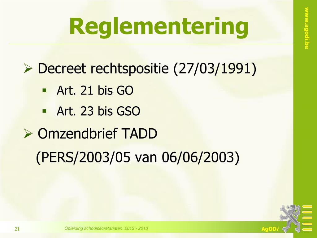 Reglementering • Decreet rechtspositie (27/03/1991) • Art. 21 bis GO • Art. 23 bis GSO • Omzendbrief TADD (PERS/2003/05 van 06/06/2003) Opleiding schoolsecretariaten 2012 - 2013