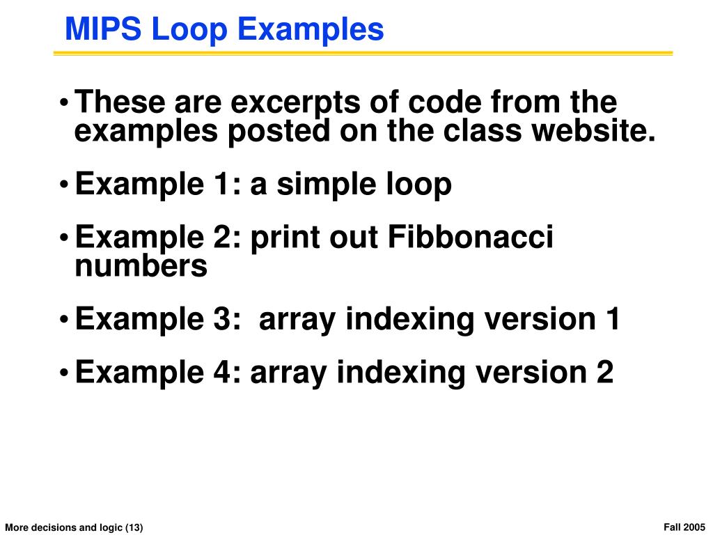MIPS Loop Examples • These are excerpts of code from the examples posted on the class website. • Example 1: a simple loop • Example 2: print out Fibbonacci numbers • Example 3: array indexing version 1 • Example 4: array indexing version 2