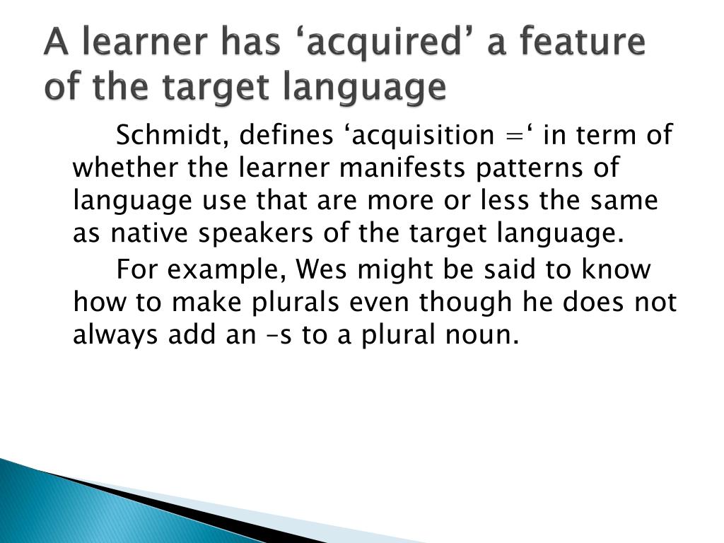 A learner has ‘acquired’ a feature of the target language Schmidt, defines ‘acquisition =‘ in term of whether the learner manifests patterns of language use that are more or less the same as native speakers of the target language. For example, Wes might be said to know how to make plurals even though he does not always add an –s to a plural noun.