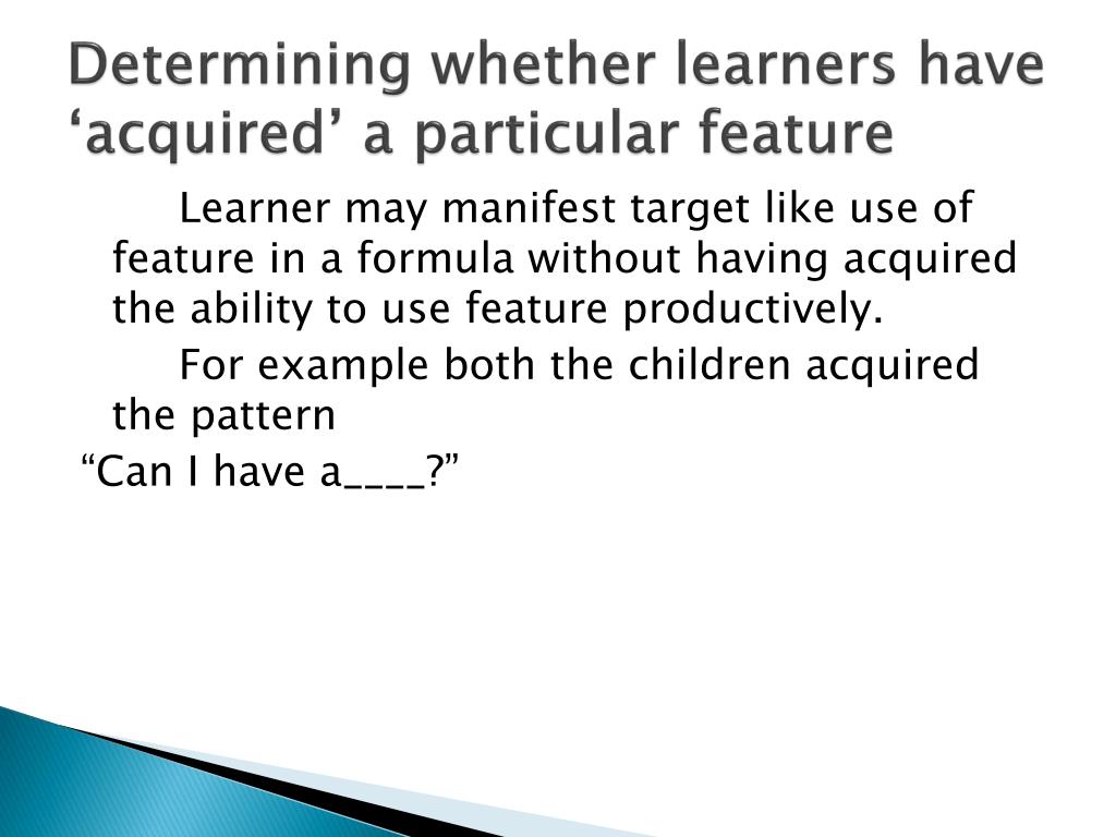 Determining whether learners have ‘acquired’ a particular feature Learner may manifest target like use of feature in a formula without having acquired the ability to use feature productively. For example both the children acquired the pattern “Can I have a____?”