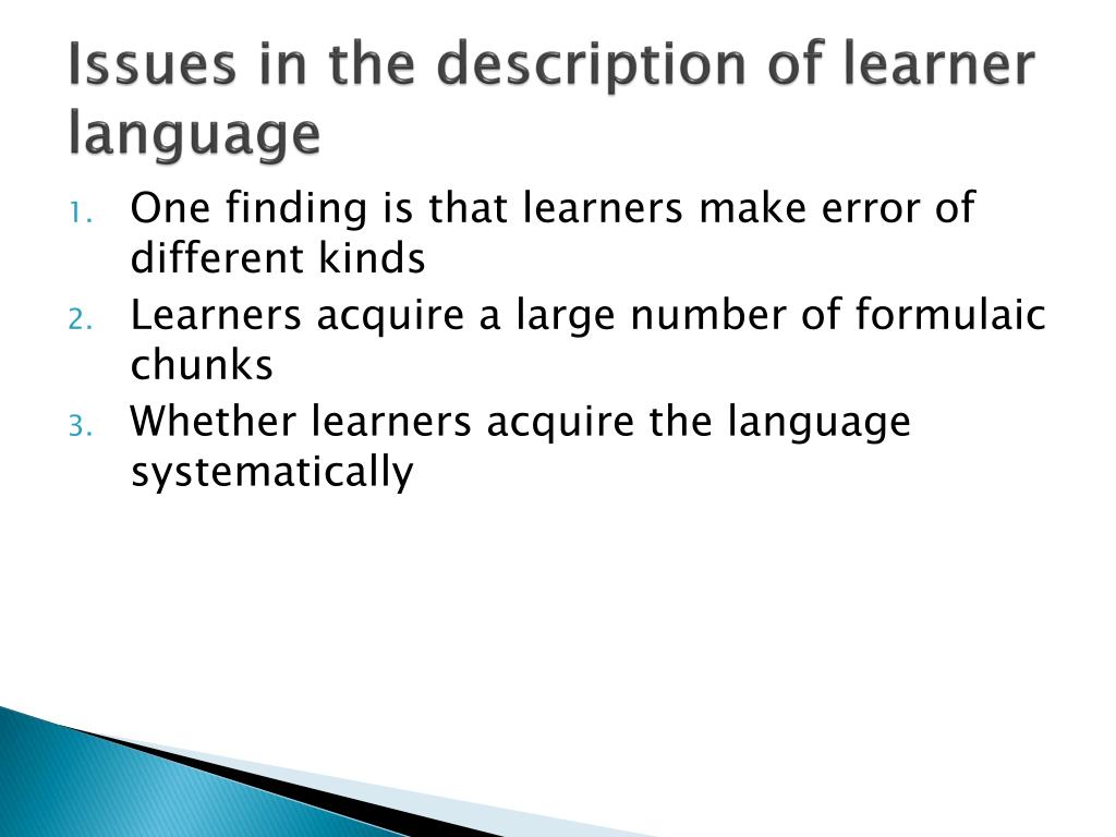 Issues in the description of learner language • One finding is that learners make error of different kinds • Learners acquire a large number of formulaic chunks • Whether learners acquire the language systematically