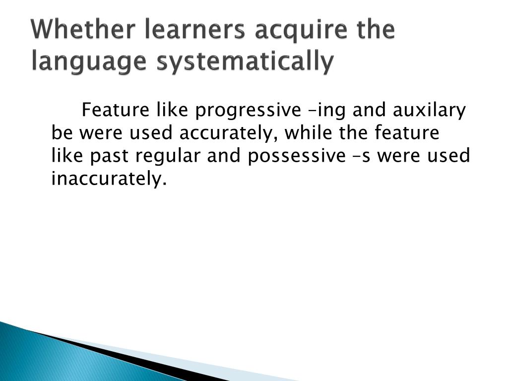 Whether learners acquire the language systematically Feature like progressive –ing and auxilary be were used accurately, while the feature like past regular and possessive –s were used inaccurately.