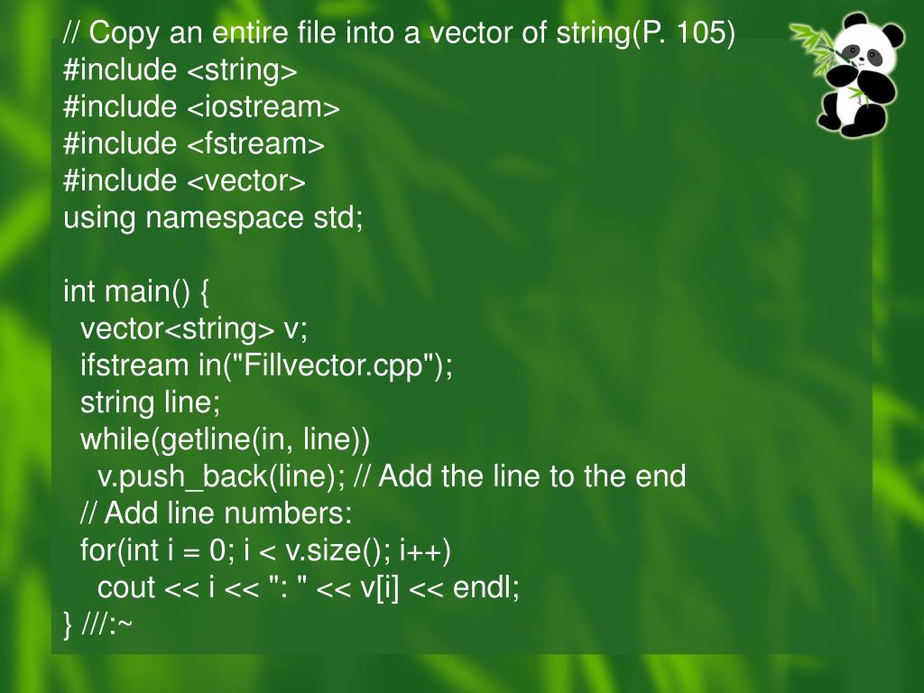 // Copy an entire file into a vector of string(P. 105) #include <string> #include <iostream> #include <fstream> #include <vector> using namespace std; int main() { vector<string> v; ifstream in("Fillvector.cpp"); string line; while(getline(in, line)) v.push_back(line); // Add the line to the end // Add line numbers: for(int i = 0; i < v.size(); i++) cout << i << ": " << v[i] << endl; } ///:~