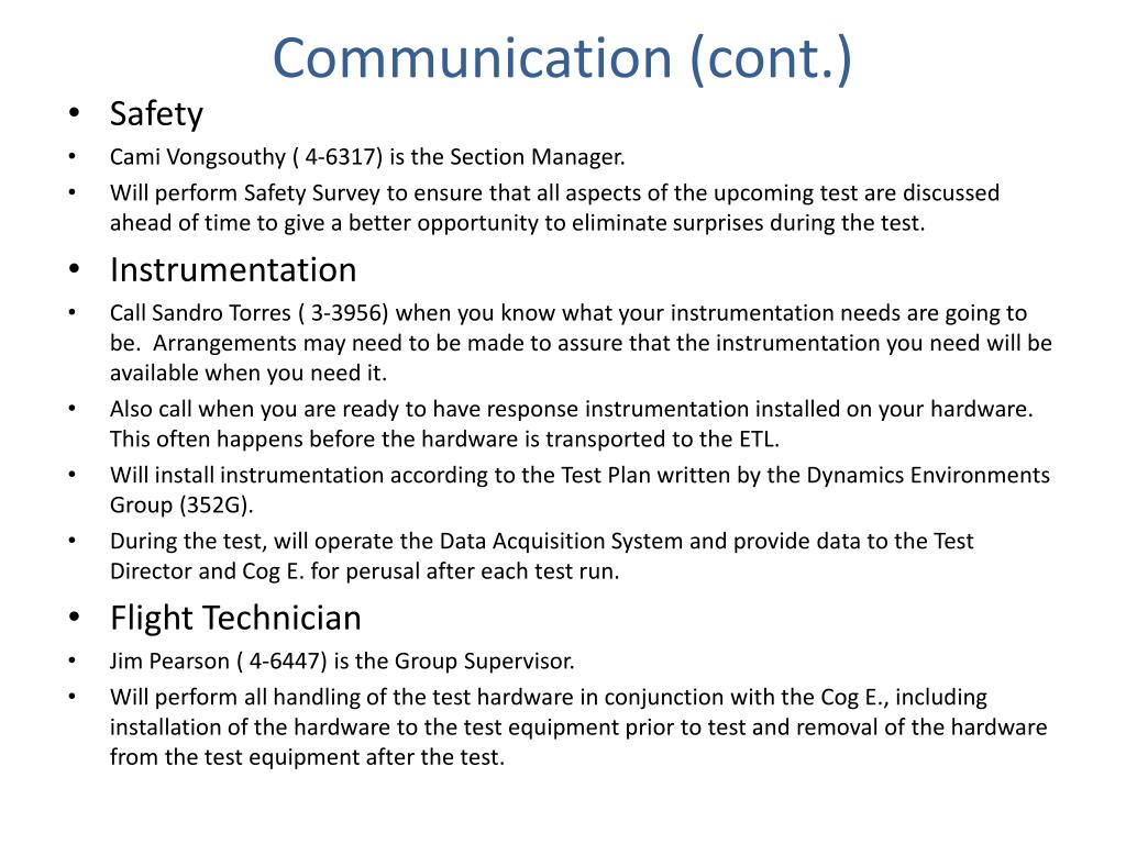 Communication (cont.) • Safety • Cami Vongsouthy ( 4-6317) is the Section Manager. • Will perform Safety Survey to ensure that all aspects of the upcoming test are discussed ahead of time to give a better opportunity to eliminate surprises during the test. • Instrumentation • Call Sandro Torres ( 3-3956) when you know what your instrumentation needs are going to be. Arrangements may need to be made to assure that the instrumentation you need will be available when you need it. • Also call when you are ready to have response instrumentation installed on your hardware. This often happens before the hardware is transported to the ETL. • Will install instrumentation according to the Test Plan written by the Dynamics Environments Group (352G). • During the test, will operate the Data Acquisition System and provide data to the Test Director and Cog E. for perusal after each test run. • Flight Technician • Jim Pearson ( 4-6447) is the Group Supervisor. • Will perform all handling of the test hardware in conjunction with the Cog E., including installation of the hardware to the test equipment prior to test and removal of the hardware from the test equipment after the test.