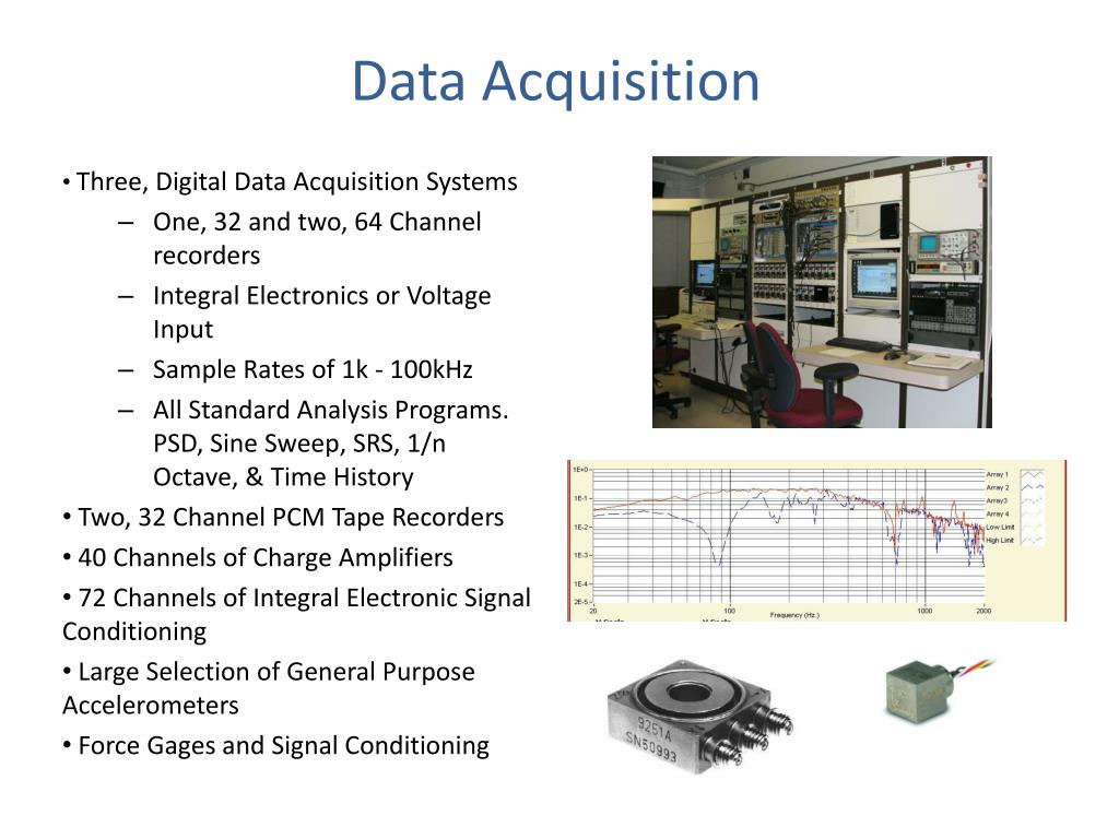 Data Acquisition • Three, Digital Data Acquisition Systems • One, 32 and two, 64 Channel recorders • Integral Electronics or Voltage Input • Sample Rates of 1k - 100kHz • All Standard Analysis Programs. PSD, Sine Sweep, SRS, 1/n Octave, & Time History • Two, 32 Channel PCM Tape Recorders • 40 Channels of Charge Amplifiers • 72 Channels of Integral Electronic Signal Conditioning • Large Selection of General Purpose Accelerometers • Force Gages and Signal Conditioning