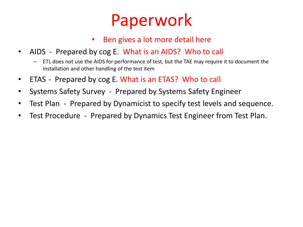 Paperwork • Ben gives a lot more detail here • AIDS - Prepared by cog E. What is an AIDS? Who to call • ETL does not use the AIDS for performance of test, but the TAE may require it to document the installation and other handling of the test item • ETAS - Prepared by cog E. What is an ETAS? Who to call • Systems Safety Survey - Prepared by Systems Safety Engineer • Test Plan - Prepared by Dynamicist to specify test levels and sequence. • Test Procedure - Prepared by Dynamics Test Engineer from Test Plan.
