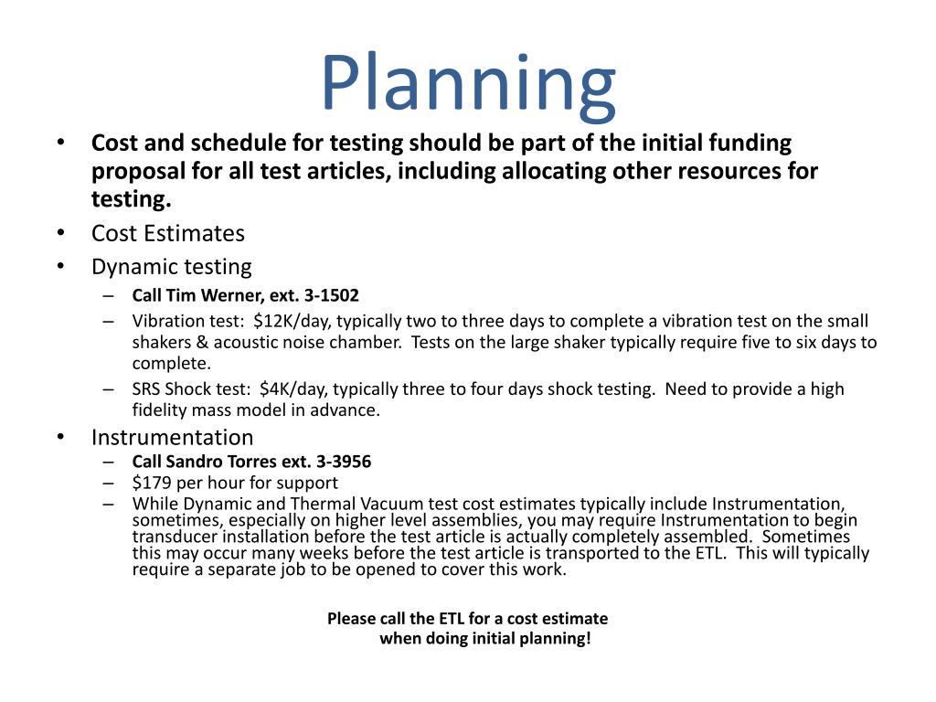 Planning • Cost and schedule for testing should be part of the initial funding proposal for all test articles, including allocating other resources for testing. • Cost Estimates • Dynamic testing • Call Tim Werner, ext. 3-1502 • Vibration test: $12K/day, typically two to three days to complete a vibration test on the small shakers & acoustic noise chamber. Tests on the large shaker typically require five to six days to complete. • SRS Shock test: $4K/day, typically three to four days shock testing. Need to provide a high fidelity mass model in advance. • Instrumentation • Call Sandro Torres ext. 3-3956 • $179 per hour for support • While Dynamic and Thermal Vacuum test cost estimates typically include Instrumentation, sometimes, especially on higher level assemblies, you may require Instrumentation to begin transducer installation before the test article is actually completely assembled. Sometimes this may occur many weeks before the test article is transported to the ETL. This will typically require a separate job to be opened to cover this work. Please call the ETL for a cost estimatewhen doing initial planning!