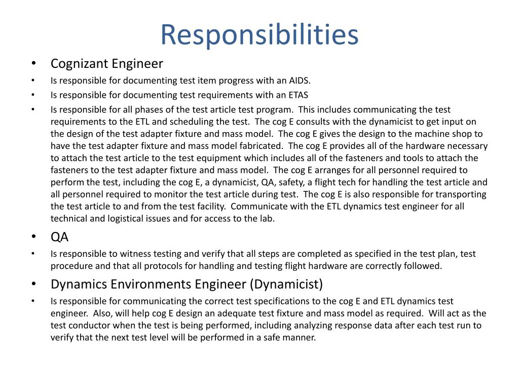 Responsibilities • Cognizant Engineer • Is responsible for documenting test item progress with an AIDS. • Is responsible for documenting test requirements with an ETAS • Is responsible for all phases of the test article test program. This includes communicating the test requirements to the ETL and scheduling the test. The cog E consults with the dynamicist to get input on the design of the test adapter fixture and mass model. The cog E gives the design to the machine shop to have the test adapter fixture and mass model fabricated. The cog E provides all of the hardware necessary to attach the test article to the test equipment which includes all of the fasteners and tools to attach the fasteners to the test adapter fixture and mass model. The cog E arranges for all personnel required to perform the test, including the cog E, a dynamicist, QA, safety, a flight tech for handling the test article and all personnel required to monitor the test article during test. The cog E is also responsible for transporting the test article to and from the test facility. Communicate with the ETL dynamics test engineer for all technical and logistical issues and for access to the lab. • QA • Is responsible to witness testing and verify that all steps are completed as specified in the test plan, test procedure and that all protocols for handling and testing flight hardware are correctly followed. • Dynamics Environments Engineer (Dynamicist) • Is responsible for communicating the correct test specifications to the cog E and ETL dynamics test engineer. Also, will help cog E design an adequate test fixture and mass model as required. Will act as the test conductor when the test is being performed, including analyzing response data after each test run to verify that the next test level will be performed in a safe manner.