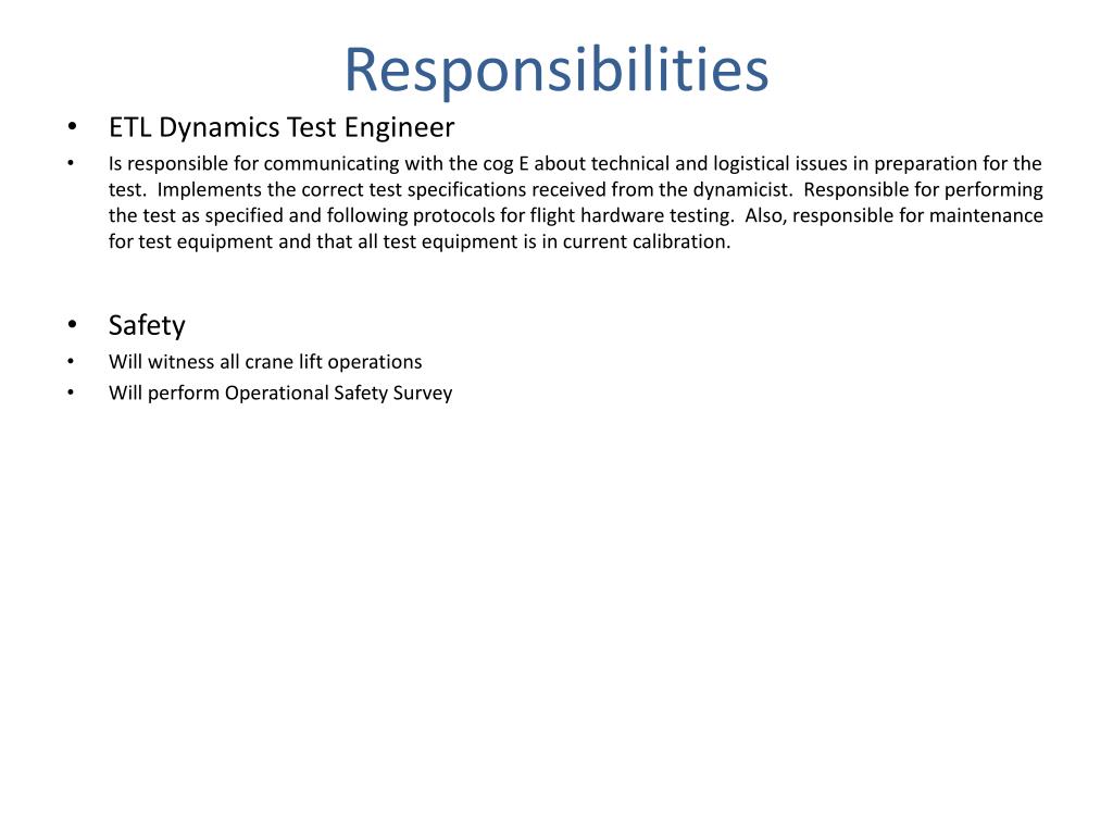 Responsibilities • ETL Dynamics Test Engineer • Is responsible for communicating with the cog E about technical and logistical issues in preparation for the test. Implements the correct test specifications received from the dynamicist. Responsible for performing the test as specified and following protocols for flight hardware testing. Also, responsible for maintenance for test equipment and that all test equipment is in current calibration. • Safety • Will witness all crane lift operations • Will perform Operational Safety Survey