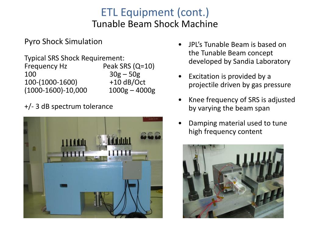 ETL Equipment (cont.) Tunable Beam Shock Machine Pyro Shock Simulation Typical SRS Shock Requirement:Frequency Hz Peak SRS (Q=10)100 30g – 50g100-(1000-1600) +10 dB/Oct(1000-1600)-10,000 1000g – 4000g+/- 3 dB spectrum tolerance • JPL’s Tunable Beam is based on the Tunable Beam concept developed by Sandia Laboratory • Excitation is provided by a projectile driven by gas pressure • Knee frequency of SRS is adjusted by varying the beam span • Damping material used to tune high frequency content