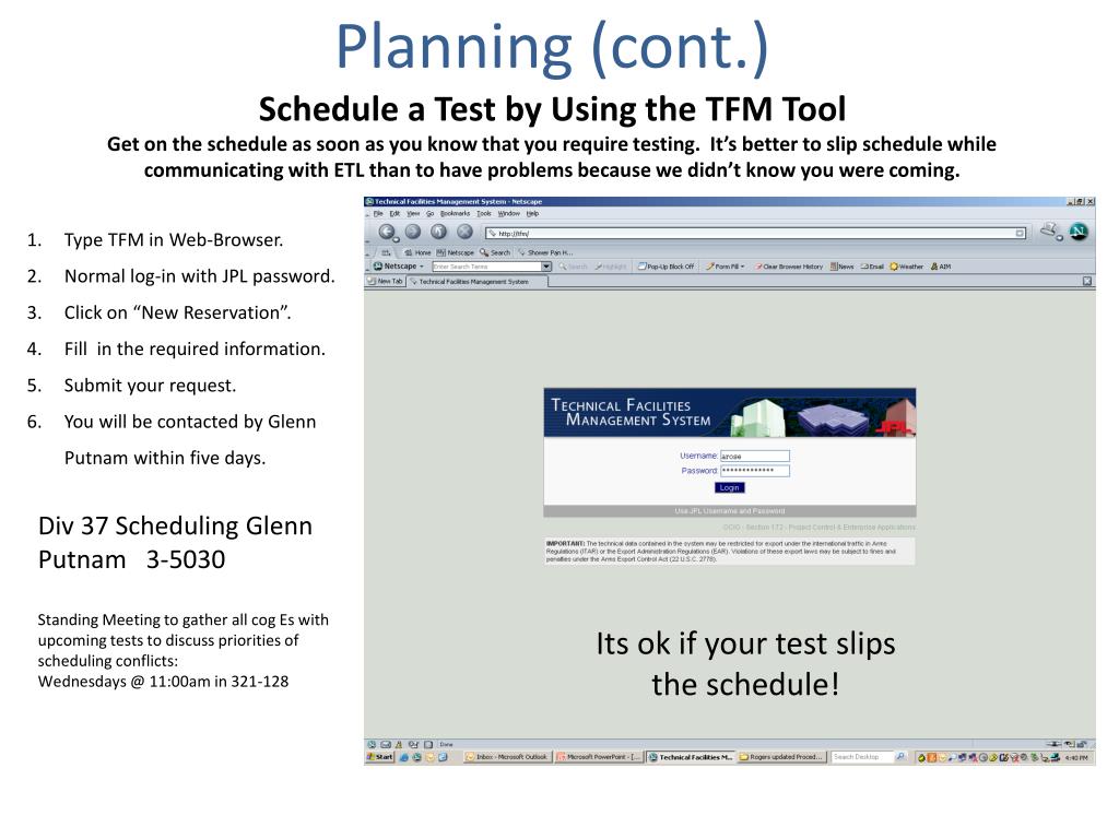 Planning (cont.)Schedule a Test by Using the TFM ToolGet on the schedule as soon as you know that you require testing. It’s better to slip schedule while communicating with ETL than to have problems because we didn’t know you were coming. Type TFM in Web-Browser. Normal log-in with JPL password. Click on “New Reservation”. Fill in the required information. Submit your request. You will be contacted by Glenn Putnam within five days. Div 37 Scheduling Glenn Putnam 3-5030 Standing Meeting to gather all cog Es with upcoming tests to discuss priorities of scheduling conflicts: Wednesdays @ 11:00am in 321-128 Its ok if your test slips the schedule!