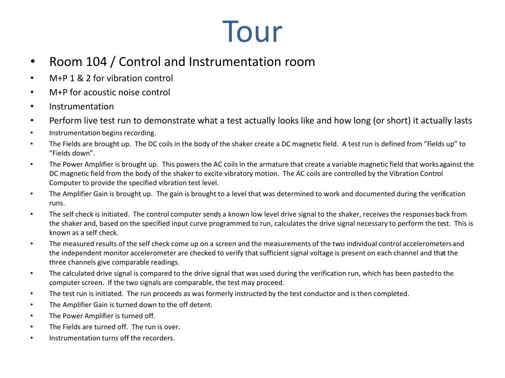 Tour • Room 104 / Control and Instrumentation room • M+P 1 & 2 for vibration control • M+P for acoustic noise control • Instrumentation • Perform live test run to demonstrate what a test actually looks like and how long (or short) it actually lasts • Instrumentation begins recording. • The Fields are brought up. The DC coils in the body of the shaker create a DC magnetic field. A test run is defined from “Fields up” to “Fields down”. • The Power Amplifier is brought up. This powers the AC coils in the armature that create a variable magnetic field that works against the DC magnetic field from the body of the shaker to excite vibratory motion. The AC coils are controlled by the Vibration Control Computer to provide the specified vibration test level. • The Amplifier Gain is brought up. The gain is brought to a level that was determined to work and documented during the verification runs. • The self check is initiated. The control computer sends a known low level drive signal to the shaker, receives the responses back from the shaker and, based on the specified input curve programmed to run, calculates the drive signal necessary to perform the test. This is known as a self check. • The measured results of the self check come up on a screen and the measurements of the two individual control accelerometers and the independent monitor accelerometer are checked to verify that sufficient signal voltage is present on each channel and that the three channels give comparable readings. • The calculated drive signal is compared to the drive signal that was used during the verification run, which has been pasted to the computer screen. If the two signals are comparable, the test may proceed. • The test run is initiated. The run proceeds as was formerly instructed by the test conductor and is then completed. • The Amplifier Gain is turned down to the off detent. • The Power Amplifier is turned off. • The Fields are turned off. The run is over. • Instrumentation turns off the recorders.