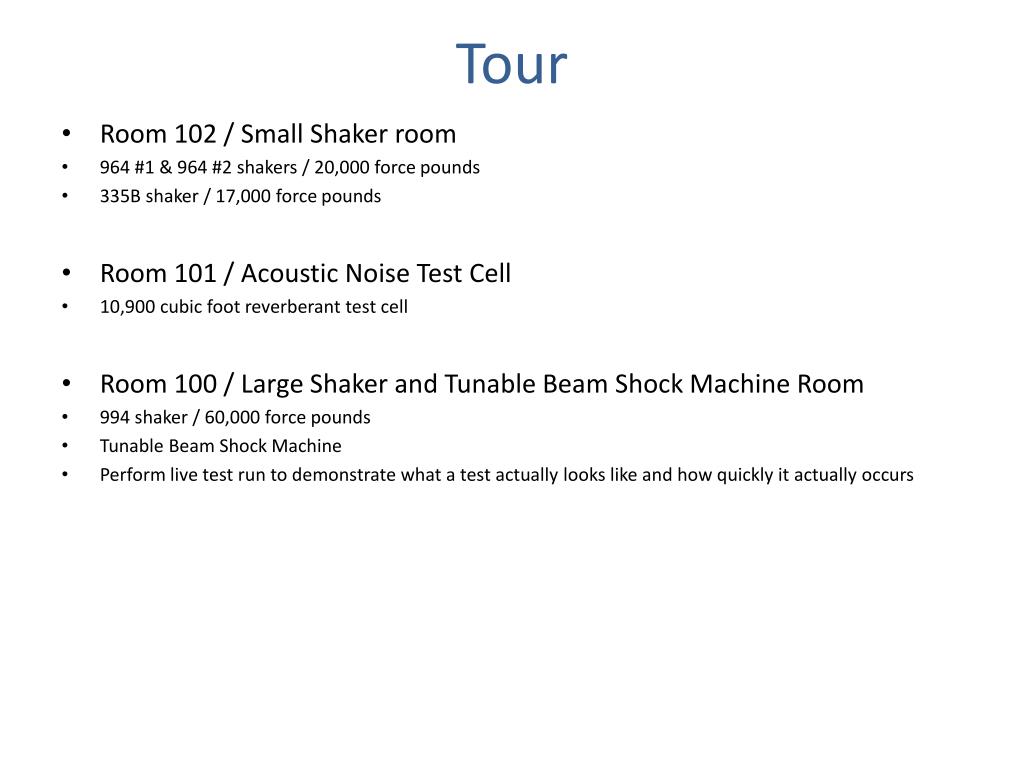 Tour • Room 102 / Small Shaker room • 964 #1 & 964 #2 shakers / 20,000 force pounds • 335B shaker / 17,000 force pounds • Room 101 / Acoustic Noise Test Cell • 10,900 cubic foot reverberant test cell • Room 100 / Large Shaker and Tunable Beam Shock Machine Room • 994 shaker / 60,000 force pounds • Tunable Beam Shock Machine • Perform live test run to demonstrate what a test actually looks like and how quickly it actually occurs