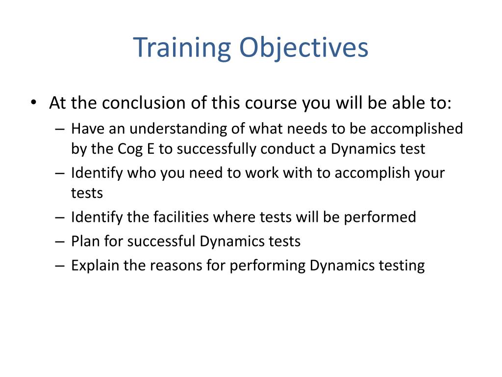 Training Objectives • At the conclusion of this course you will be able to: • Have an understanding of what needs to be accomplished by the Cog E to successfully conduct a Dynamics test • Identify who you need to work with to accomplish your tests • Identify the facilities where tests will be performed • Plan for successful Dynamics tests • Explain the reasons for performing Dynamics testing