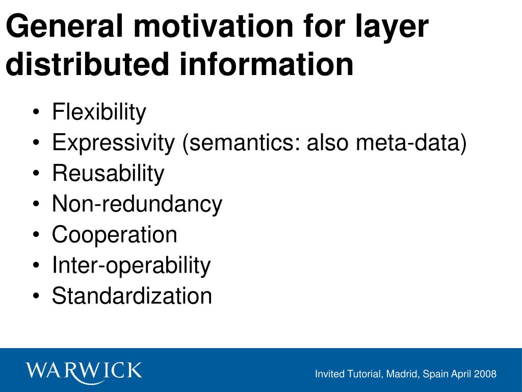 General motivation for layer distributed information • Flexibility • Expressivity (semantics: also meta-data) • Reusability • Non-redundancy • Cooperation • Inter-operability • Standardization Invited Tutorial, Madrid, Spain April 2008