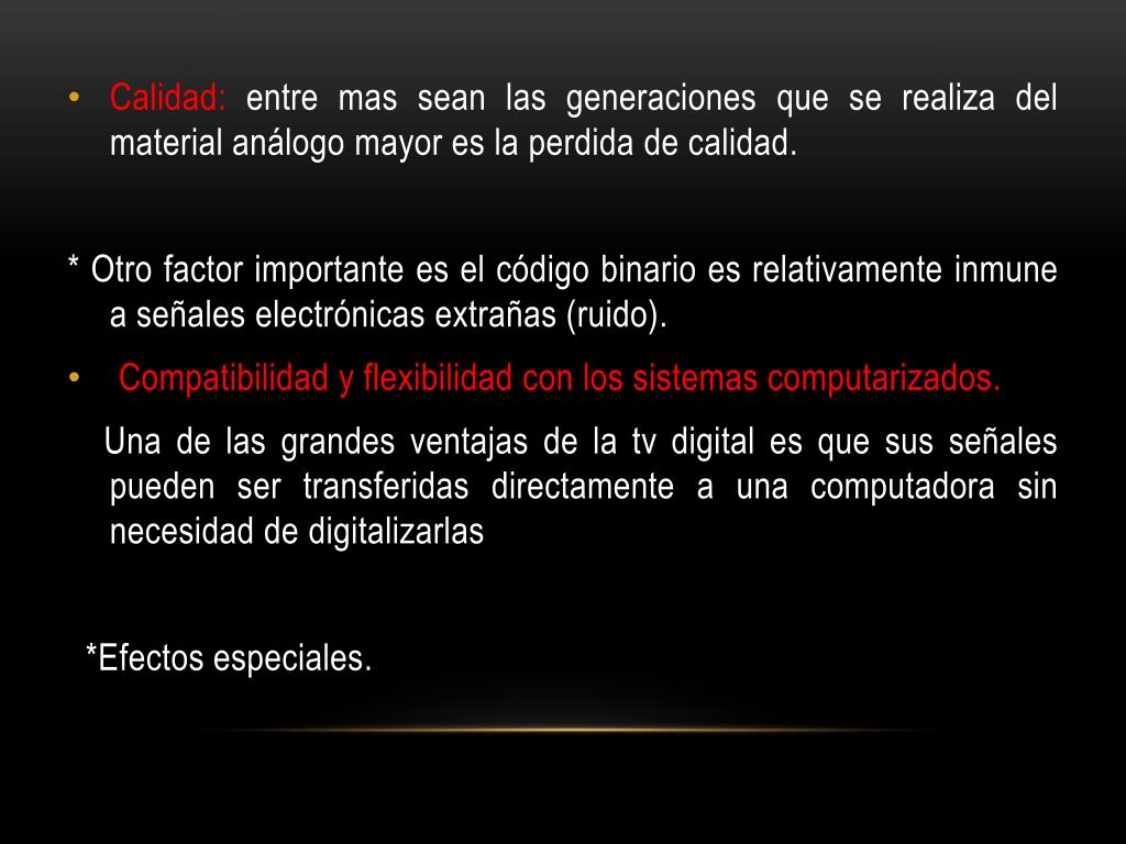 Calidad: entre mas sean las generaciones que se realiza del material análogo mayor es la perdida de calidad. * Otro factor importante es el código binario es relativamente inmune a señales electrónicas extrañas (ruido). • Compatibilidad y flexibilidad con los sistemas computarizados. Una de las grandes ventajas de la tv digital es que sus señales pueden ser transferidas directamente a una computadora sin necesidad de digitalizarlas *Efectos especiales.