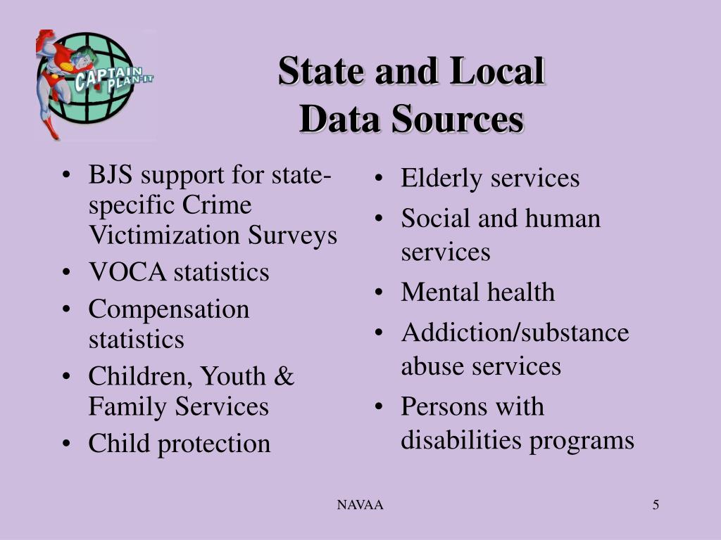 BJS support for state-specific Crime Victimization Surveys VOCA statistics Compensation statistics Children, Youth & Family Services Child protection Elderly services Social and human services Mental health Addiction/substance abuse services Persons with disabilities programs State and Local Data Sources NAVAA