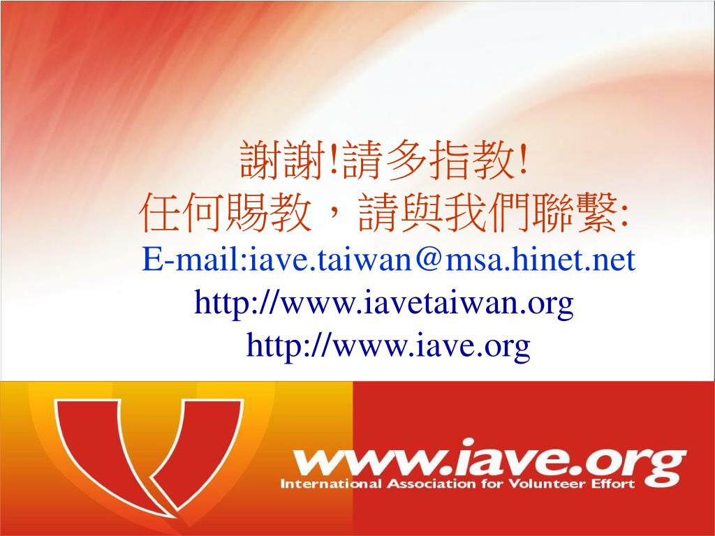 謝謝!請多指教!任何賜教,請與我們聯繫: E-mail:iave.taiwan@msa.hinet.net http://www.iavetaiwan.org http://www.iave.org 台灣志願服務國際交流協會IAVE Taiwan
